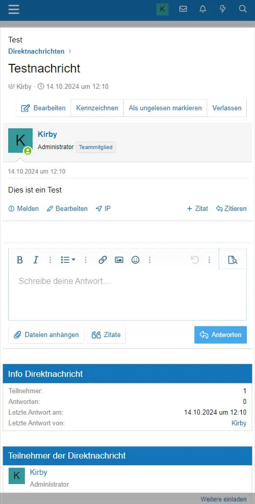 Falls die Direktnachricht über ein Benutzerprofil gestartet wurde, so ist dieser als Teilnehmer bereits vorgemerkt. Es können, je nach Einstellung des Forums, noch weitere Benutzer zur Direktnachricht eingeladen werden.