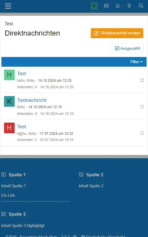 Im Gegensatz zum klassischen Nachrichtensystem stellt XenForo dem Benutzer ein deutlich leistungsfähigeres Direktnachrichtensystem zur Verfügung. Die Kopfzeile enthält einen Link zu den Direktnachrichten in Form eines Briefumschlags.