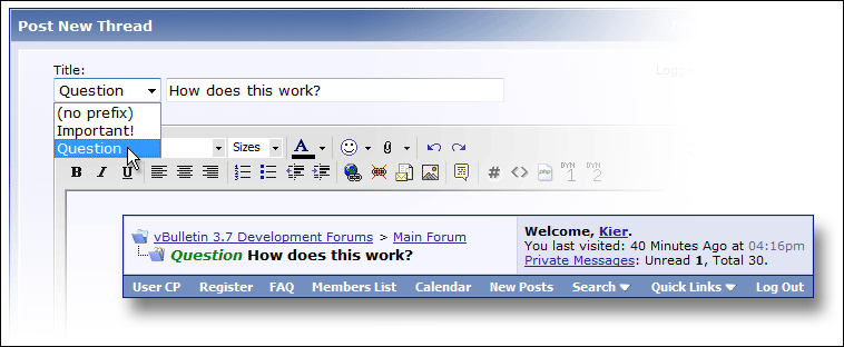 Jetzt sind sie da und jedem Thema kann ein forumspezifisches Präfix gegeben werden, das die Art des Themas kennzeichnet, sei es eine Frage (Question), ein Hinweis (Important!), oder im Kleinanzeigen Forum (Suche), (Biete) etc.